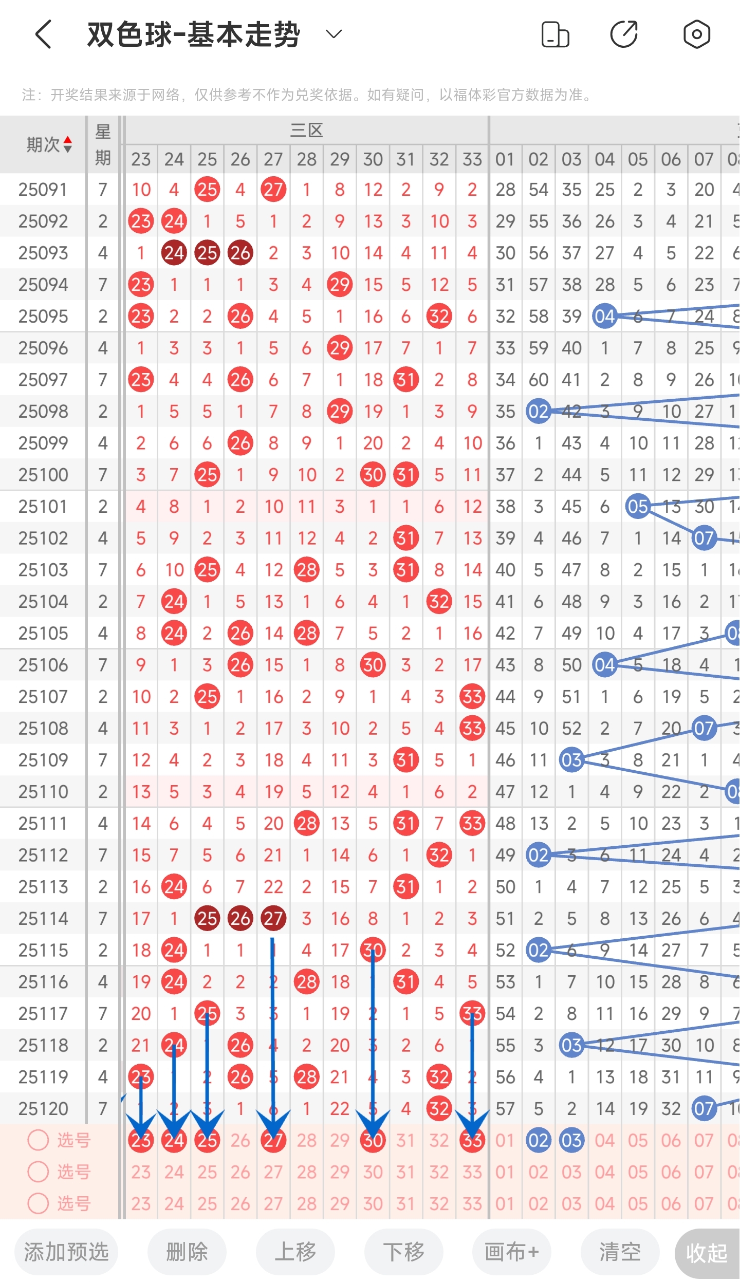 上一期三区开出了32号球。往前一期出了23,26,28和32号球。通过走势图分析,可以看到上期开出了1个号码,本期应该会有所增加。除此之外最近三区是比较热门的,开出的号码多在左边和右边的号码。因此本期我们可以重点关注左边的号码,其次是右边,最后可以防一下中间。然后再结合冷热号和遗漏期数,本期我们可以关注23,24,25,27,30,33等号。综上所述本期我们推测有可能开出23,24,25,27,30,33等号码。