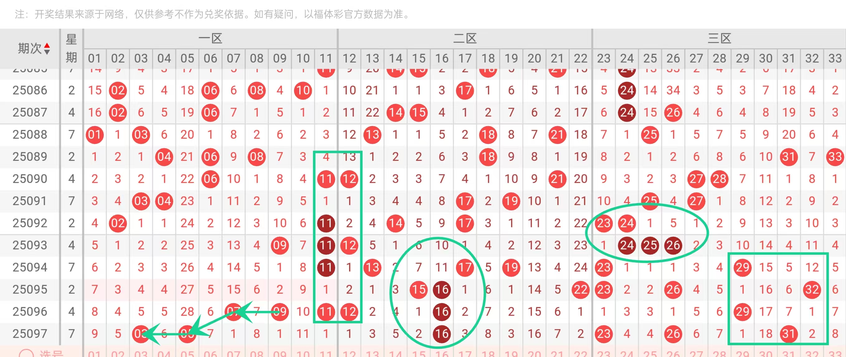 第一区间(1-11):出现频率较高,尤其是 06、07、09、10、11;
