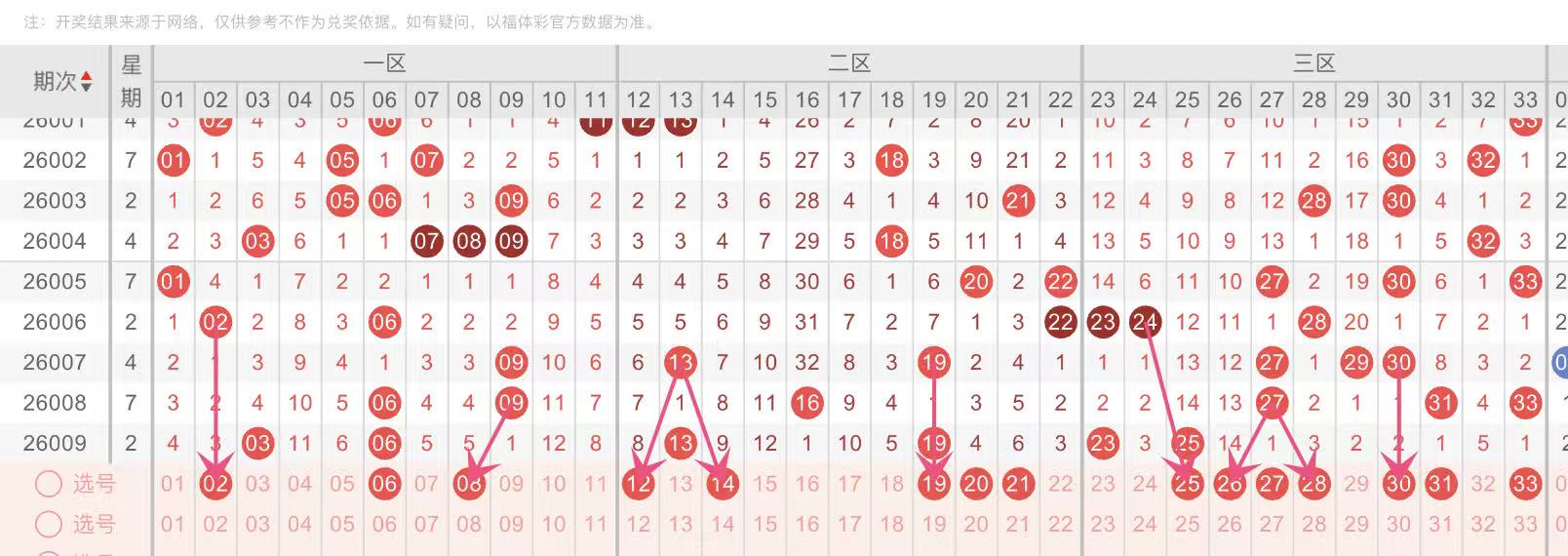 红球三区比:本期红球三区比为 2:2:2,近五期红球区间比分别为 1:2:3,2:1:3,1:2:3,2:1:3,2:2:2本期预计红球三区比为 2:2:2。