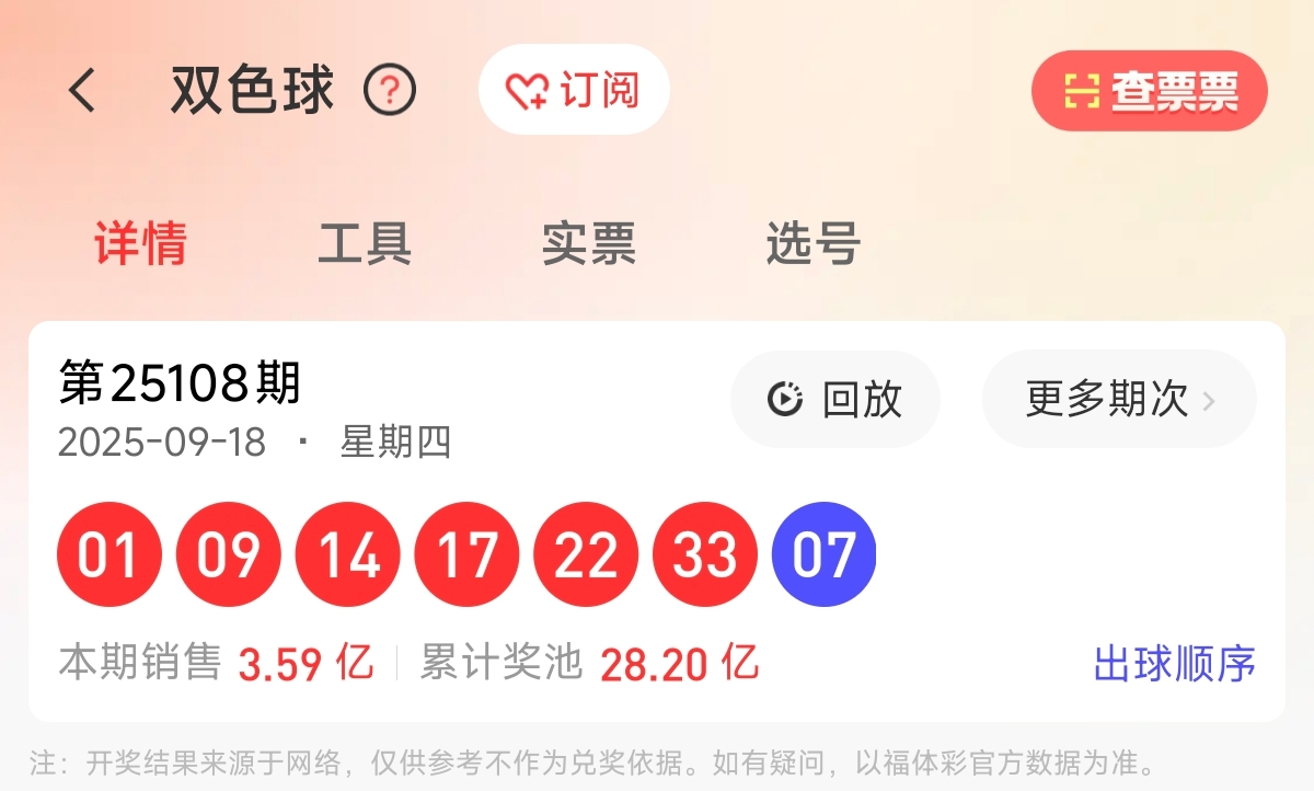 首先让我们回顾一下上期双色球25108期的开奖号码为01、09、14、17、22、33,蓝球07。和值96,跨度32,区间比为2:3:1,奇偶比为4:2。