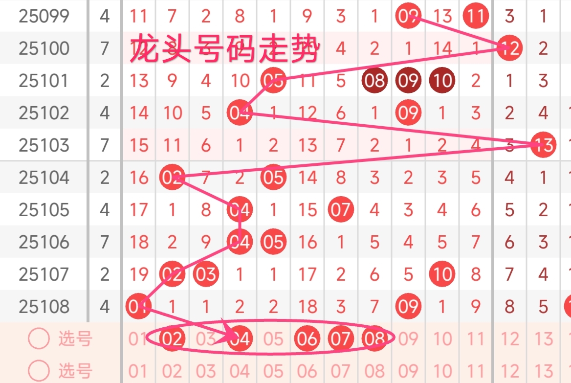 上期龙头号码为01,振幅下降了1点,开出奇数号码。从近期龙头号码走势来看,近期龙头号码波动频繁。上期龙头为 01,属于小数、奇数。观察近期龙头号码走势,小数出现较为频繁,奇数也占据一定比例。本期龙头号码可能继续在小数范围内选择,推荐关注 02 - 10之间。本期还需关注遗漏值较高的号码,本期有望龙头号码热出的区域。综合考虑,本期龙头号码可重点关注02、04、06、07、08。