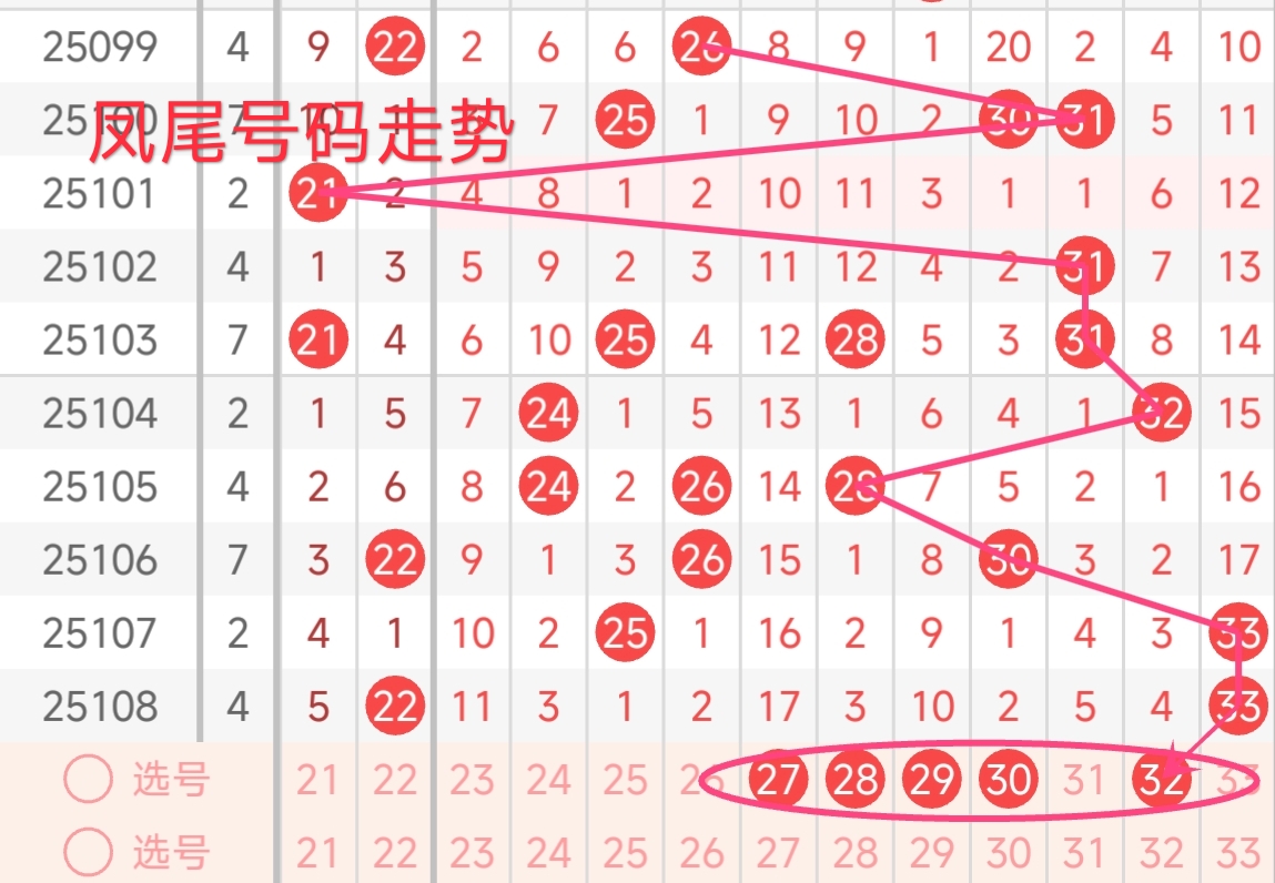 上期凤尾号码为33,开出重号,振幅为零点,开出了奇数号码。回顾近期凤尾号码,振幅波动较大。上期凤尾为33,属于大数、奇数。近期凤尾号码大数居多,奇数也较为常见。本期凤尾号码预计仍在大数区域,可以注意偶数号码,本期凤尾号码推荐关注 26-33区间。本期还需注意一些连续漏出的号码有望在本期热出。本期凤尾号码可重点关注27、28、29、30、32。