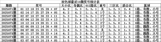 上期奇偶比为3:3,奇偶红球走势相当,近10期奇偶比为26:34,偶数开出比例较高,其