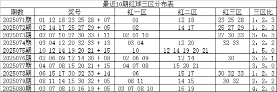一区上期走热,开出4个红球,近10期开出21个红球,走势与理论相当,本期看好转热,开出3个号码,参考号码03、06、09;二区上期走温,开出2个红球,近10期共开出22个红球,出号比例与理论持平,本期预计继续走温,出现1-2个红球,注意号码22;三区上期走冷断区,近10期共开出17个红球,走势相对较冷,本期预计继续温冷,看好号码27、32;
