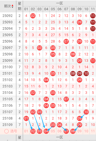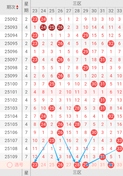 根据走势图可以看出当前区,100期开出了25.30.31三个号码球,101期没有开出号码球,102期开出了31一个号码球,103期开出了25.28.31三个号码球,104期开出了24.32二个号码球,105期开出来24.26.28三个号码球,106期开出了26.30二个号码球,107期开出了25.33二个号码球,108期开出33一个号码球 ,109期开出31一个号码球 ,按照如此规律判断本期当前区可能开出1单或1单1双。我们看下当前区上期没有开出重叠号,那么本期当前区要定重叠号的情况下可关注31码球。再看下当前区上期没有开出斜连号,当期选号得留意32斜连号。本区重点关注23.26.28.29.32