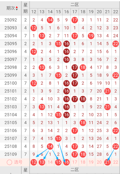 根据走势图可以看出当前区段,100期开出了12.16.17三个号码球,101期开出了16.21二个号码球,102期开出了16.17.18三个号码球,103期开出13.16.21三个号码球, 104期开出了15.16二个号码球,105期开出来18一个号码球,106期开出了17.22二个号码球,107期开出了15一个号码球,108期开出了14.17.22三个号码球,109期开出17.18二个号码球 ,按照如此规律本期当前区可能开出1单1双。我们看下当前区上期开出17重叠号,那么本期当前区要定重叠号的情况下可关注18号码球。再看下当前区上期开出18斜连号,当期选号得留意斜连16号码球。本区重点关注12.13.15.16.21