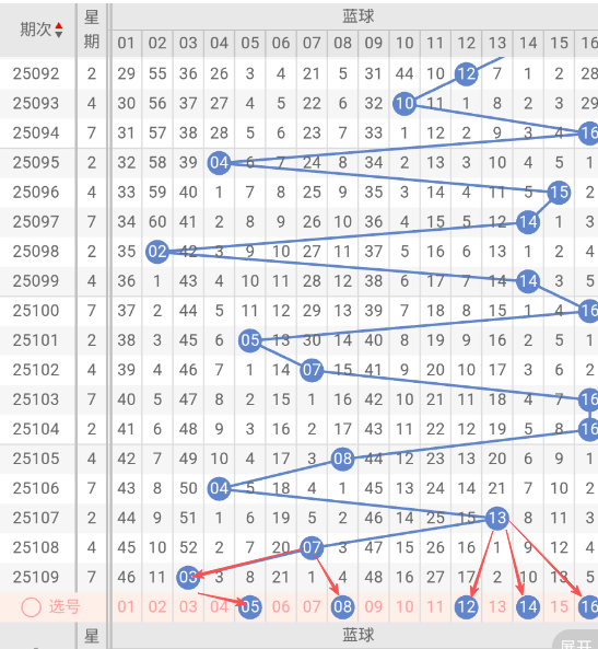 根据走势图近10期的走势看,蓝球在094期开出16蓝球之后,1小2大1小2大1小2大2小1大2小,再看下近10期的蓝球热码有回补的趋势,这种趋势规律本期判断极有可能开出大号,本期防蓝球04小号,蓝球本期重点关注05,08,12,14,16