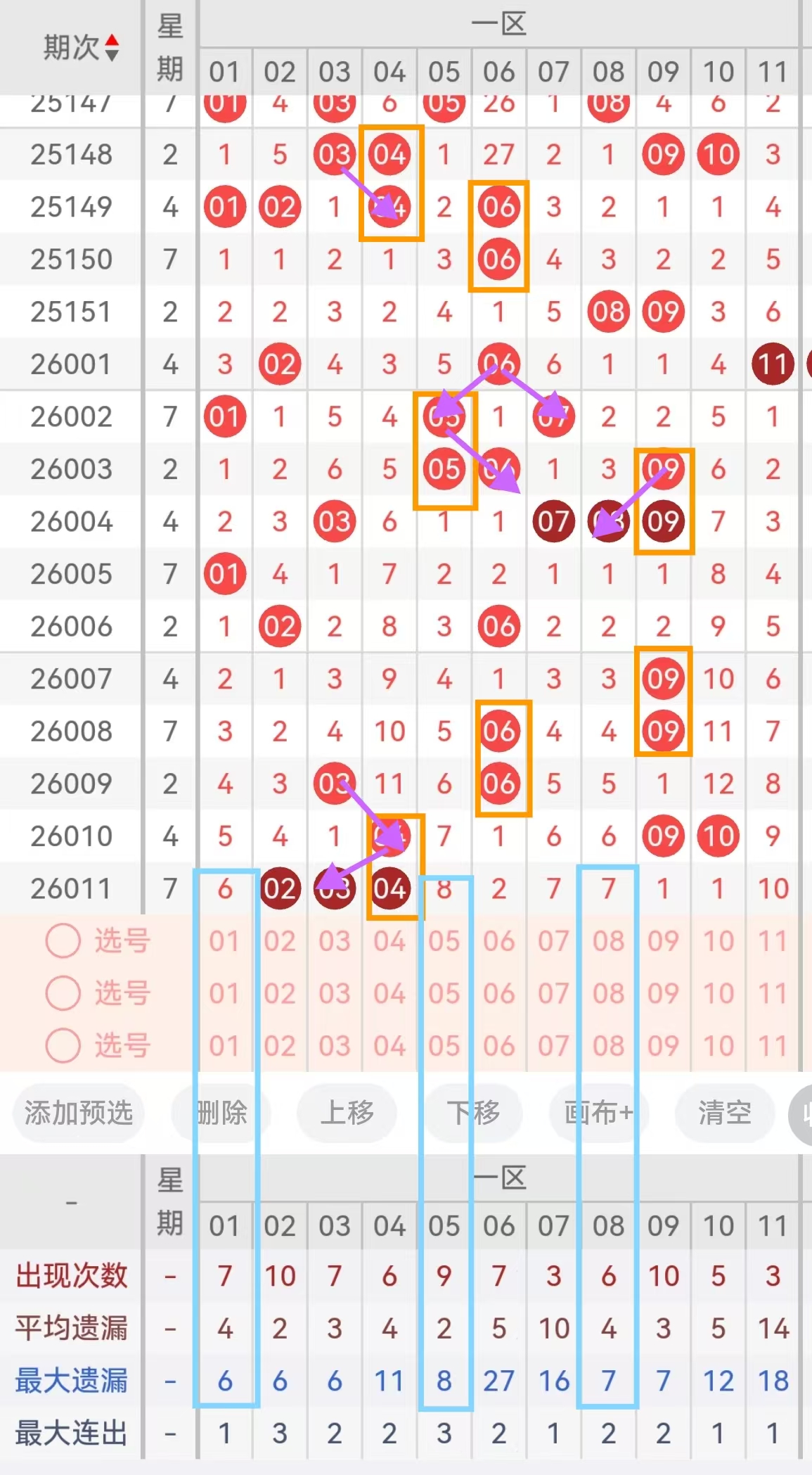 一区本期选号建议首先考虑重01、05号,一区近15期一共开出了9次邻号,说明一区开出邻号的概率较大,本期有可能会继续开出邻号,并且这两个号遗漏期数较大,并且达到了自身最大遗漏期号,可以考虑开出;其次可以考虑02号和03号,一区近15期一共开出了7次重号,说明一区开出重号的概率较大,本期有可能会继续重号,可以考虑开出重号。目前一区没有遗漏超过十期的号,08号是目前一区遗漏期数较大的号可以考虑开出,可以防冷号开出。