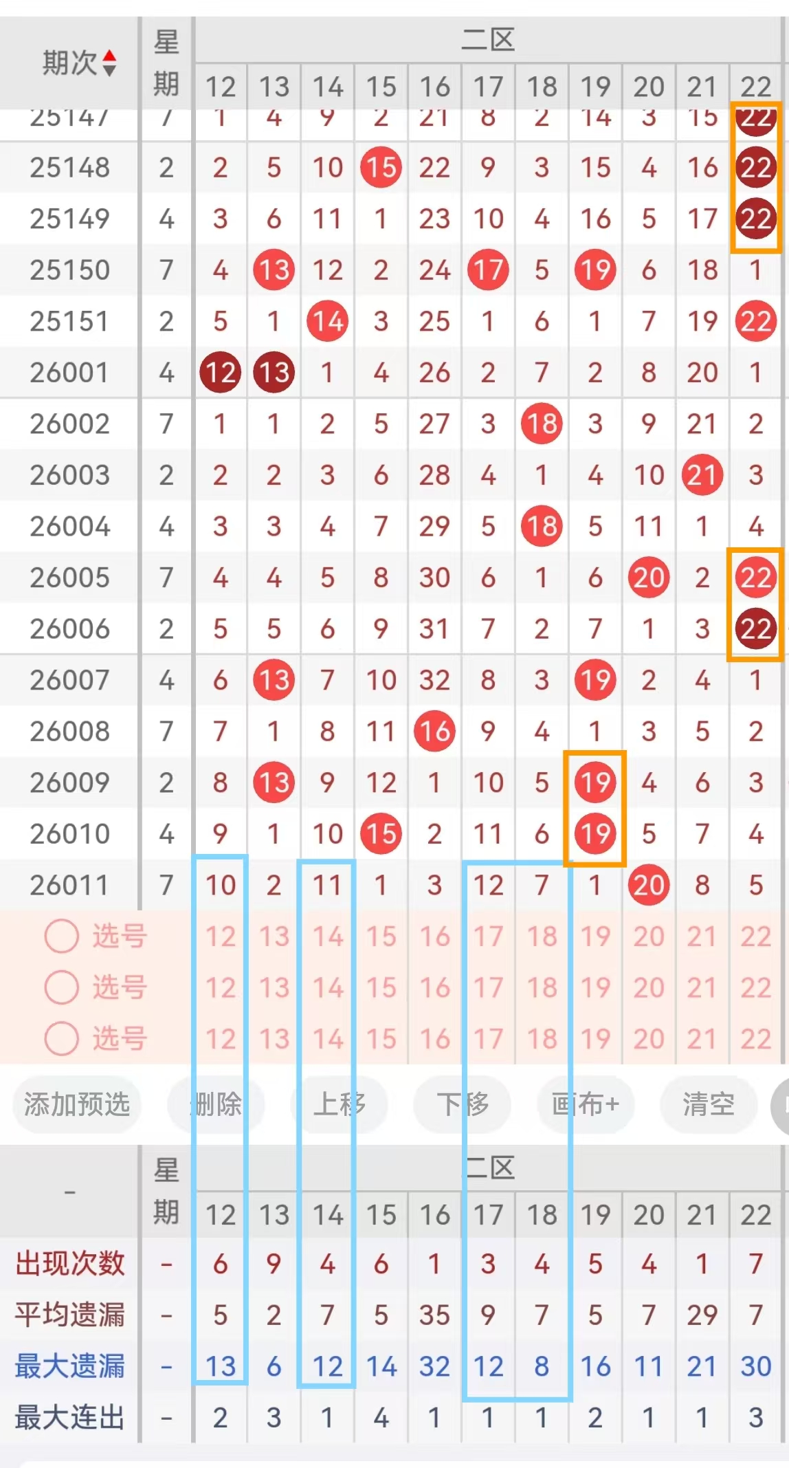 因此,双色球红球第26012期红球二区考虑开出一个号或断区,精选5码参考:12、14、17、18、20