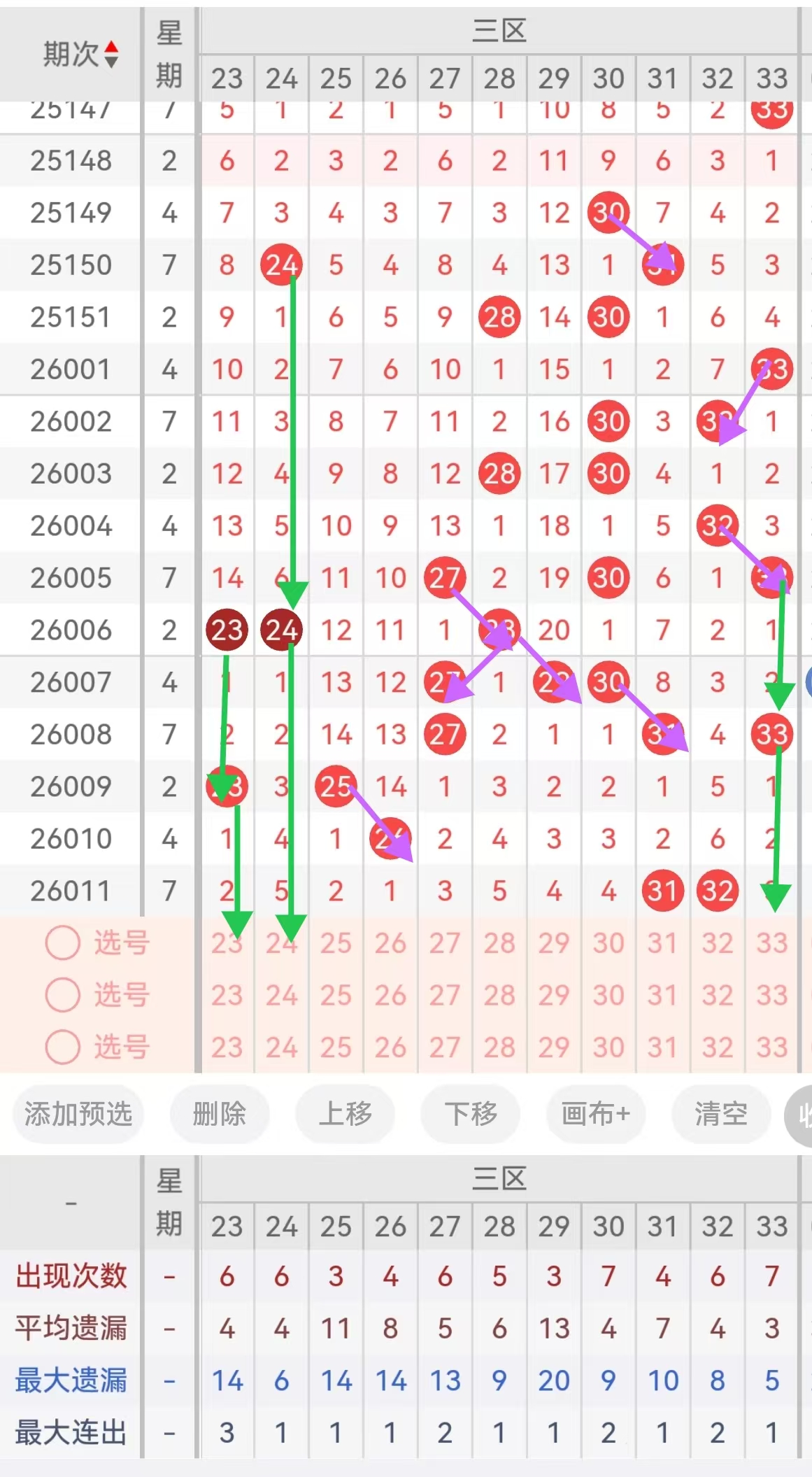 三区看好开出邻号33号,三区近15期出现8次邻号,说明三区开出邻号的概率很大,并且如果本期开出,那么就会形成2-3形态;30号也可以考虑作为31号的邻号开出。其次考虑隔期号,23号上次开出前隔了2期,如果本期开出将形成2-2形态,可以考虑开出;24号同样可以考虑,如果本期开出将形成6-5形态,也可以考虑开出。