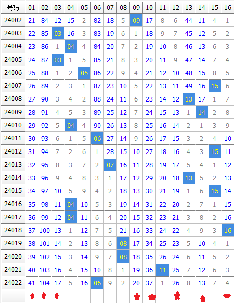 (数字为遗漏期数,蓝色标记的为遗漏超过10期的大冷号)