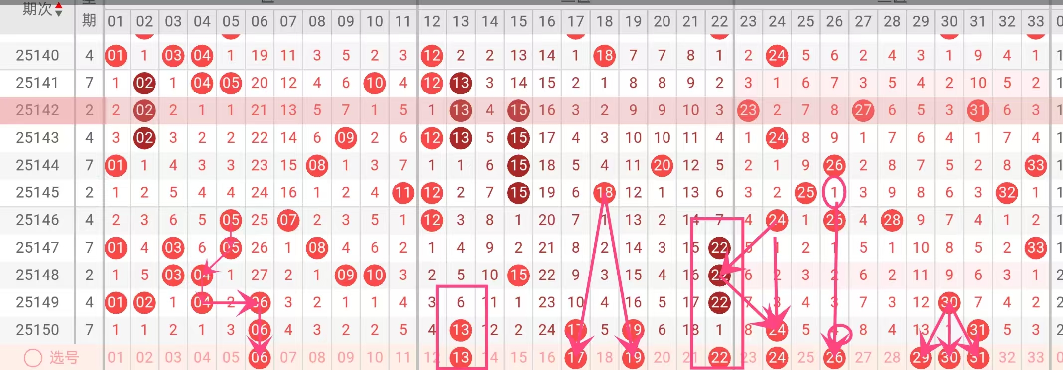 红球06、24在近10期分别出现4次和5次,属于高频热码,06在近期常与13、17形成小中区组合,24则与26、30等形成大中区联动,具备较强的出号惯性。