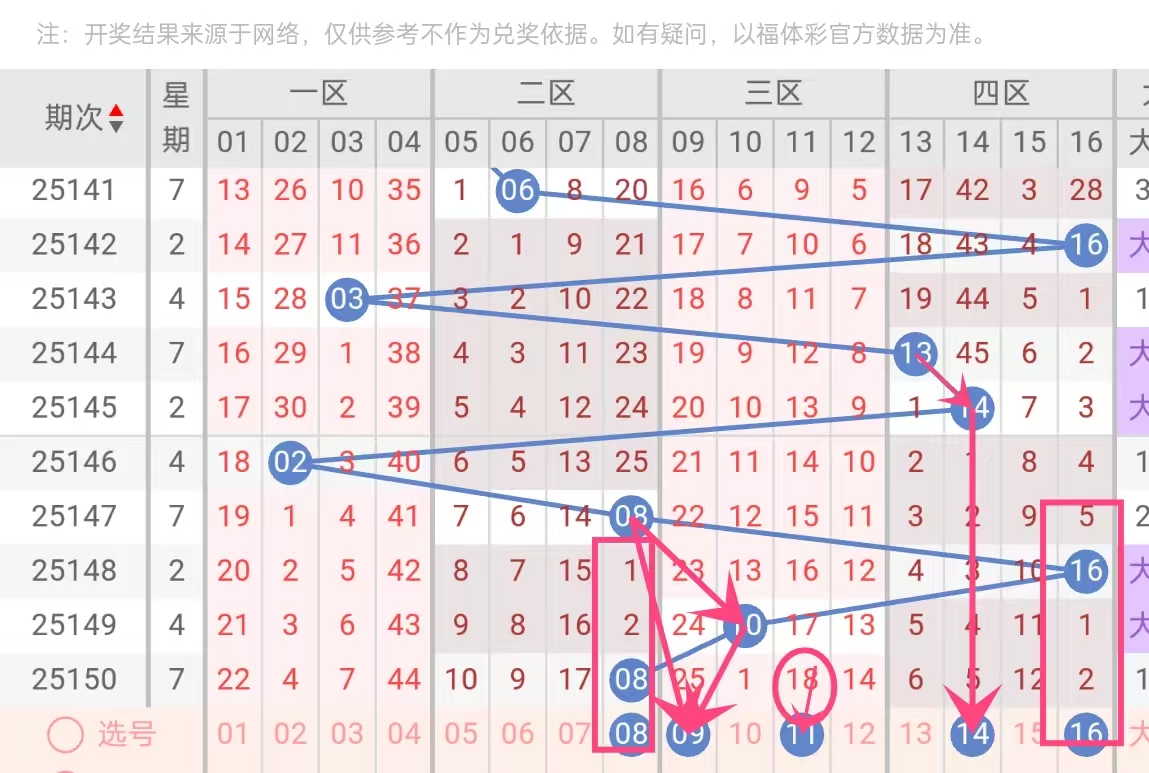 所选5蓝中,大蓝(09、11、14、16)占4枚,小蓝(08)占1枚;奇蓝(09、11)占2枚,偶蓝(08、14、16)占3枚,符合近期蓝球以大号、偶数为多的趋势。