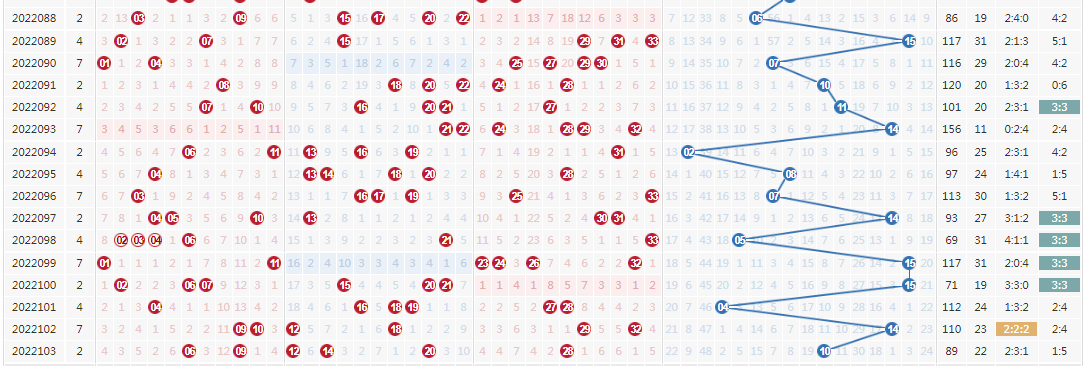 上期开出2个重号:09、12,近10期重号共开出5个,有4期奖号包含了重号,表现相对较冷,本期注意重号继续走冷,排除上期中奖红球。