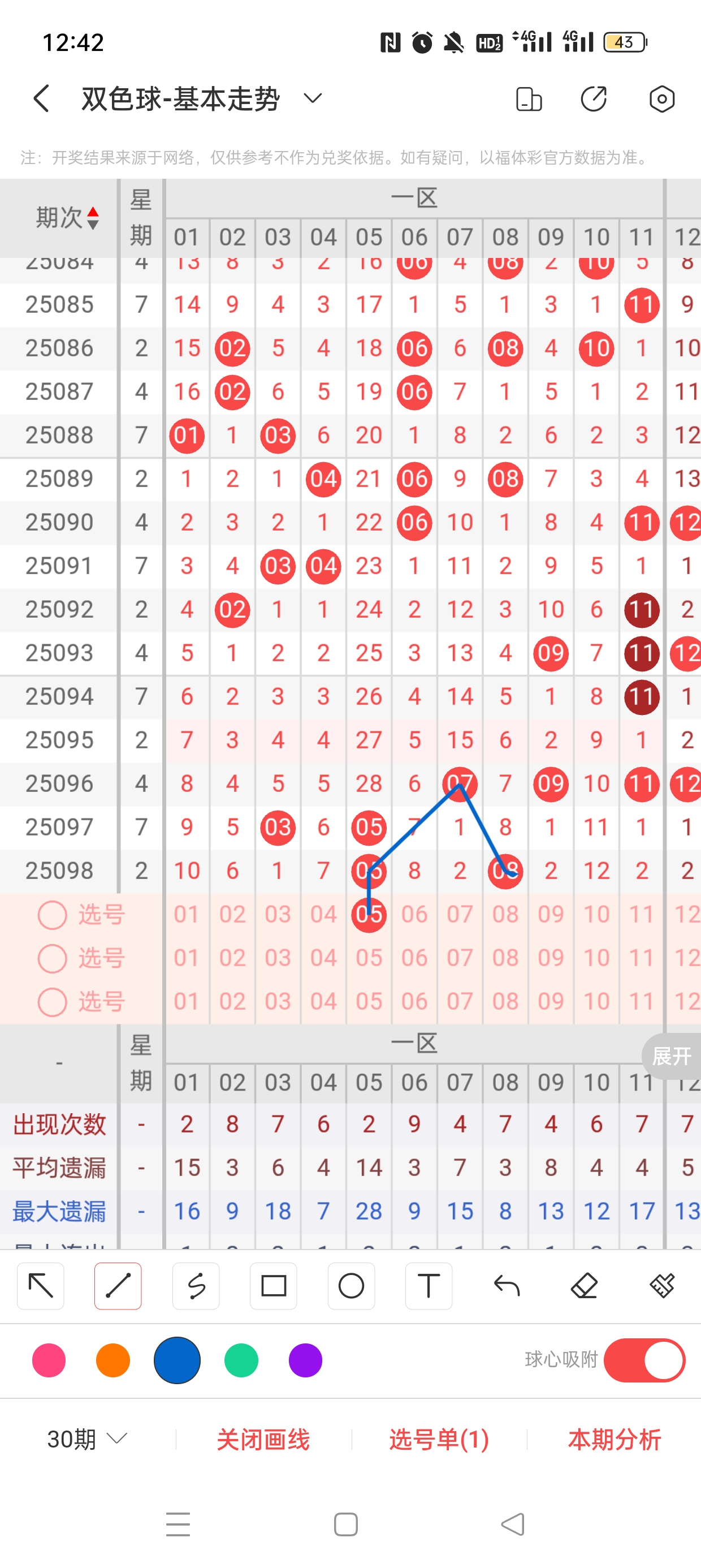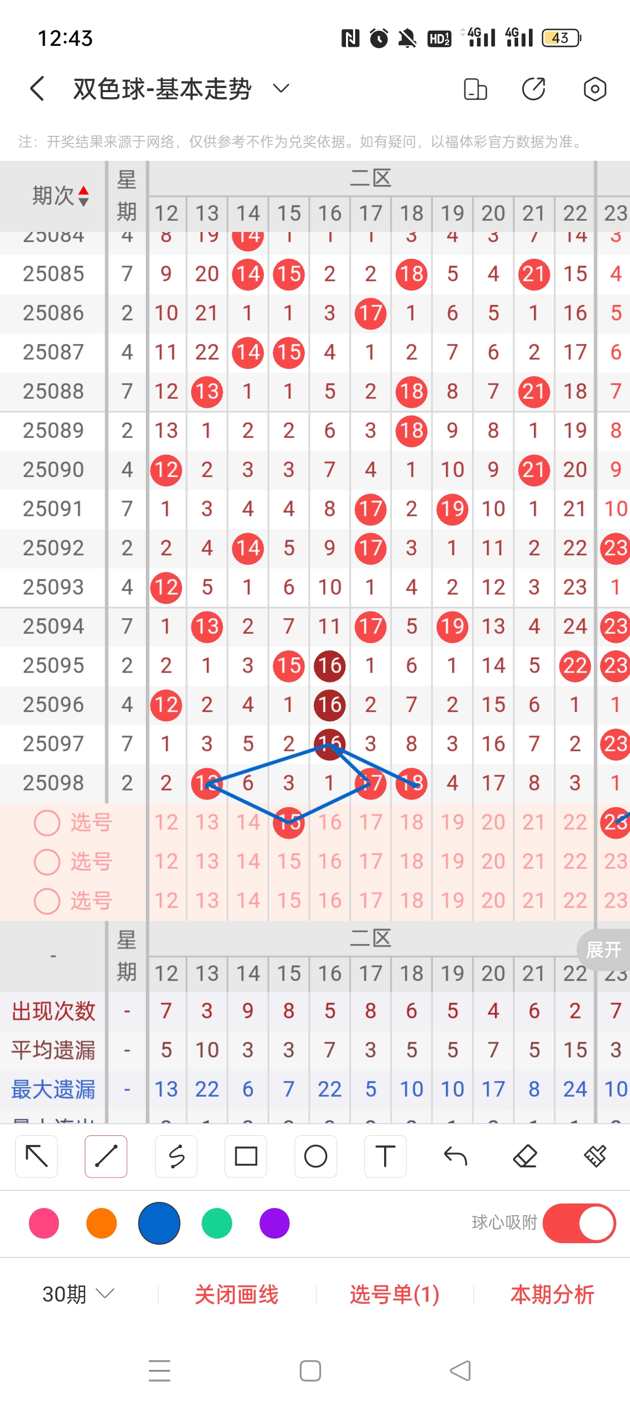 后区(1-16)近96期本区012路23:29:46,1/2路热度高,本期着重0路。1已遗漏35期,与2之间呈现向左遗漏递减态势,需防。7、9分别遗漏27期、37期,两者与4之间呈现向右遗漏递减态势,需防。