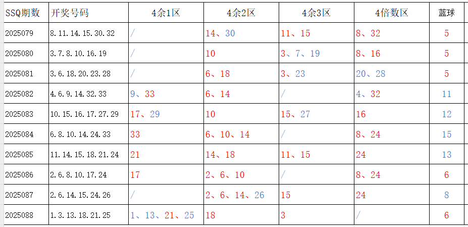 分享第一个数据分析:四分区统计数据。相对于传统的三分区,个人习惯使用四分区,就是把33个红球号码除以4,所得的余数分区如下: