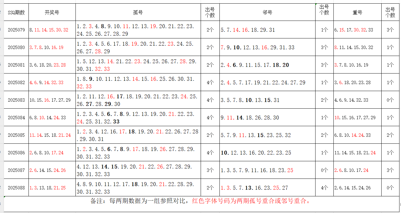 如图,以近两期数据为一组,进行对比分析。相同的孤号、邻号,可能在下期出1-4个左右。上期孤号开出2个,邻号开出4个,重号0个。本期参考孤号:5.6.7.8.9.10.11.15.16.23.27.28.29.30.31.32.33;邻号:2.4.12.14.17.19.20.22.24.26。孤、邻号重合号码精选:***(会员专区可见)。个人分析,仅供参考。