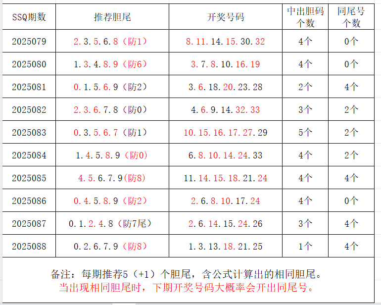 如图,每期推荐胆尾中出1-4个。上期推荐胆尾中出1尾1码!推荐胆尾是按照公式计算的顺序,不定位红球号码的顺序。本期推荐胆尾:9尾/7尾/4尾/5尾/0尾  。加推重点胆尾:***(会员专区可见)。推荐胆码号码:***(会员专区可见)。个人分析,仅供参考。