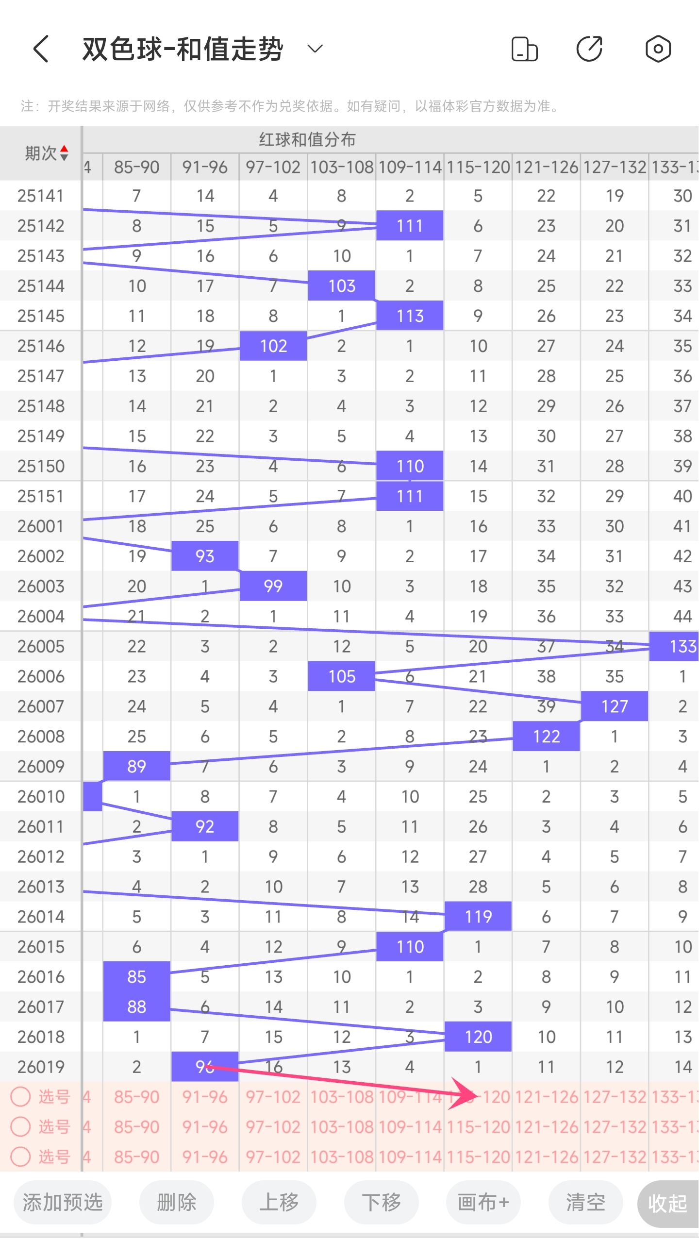 上期和值为96,而近5期和值为110,85,88,120,96,上期和值较前一期减少了24,振幅为24。96和值是属于近30期内开出的比较小的和值,下降的空间比较小,上升的空间比较大。本期看好和值变大,所以推测本期和值趋势是大概率往右,和值变大,小概率往左,和值变小。