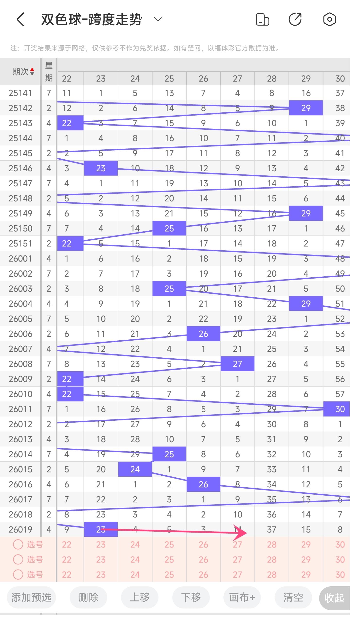 上期龙头为7,凤尾为30,跨度为23,往前一期跨度是19,偏移量为4。23跨度值是30期内开出比较小的跨度值。上升的空间很大,下降空间很小,本期看好跨度变大,所以推测本期跨度趋势是往右的,跨度变大,小概率往左,跨度变小。