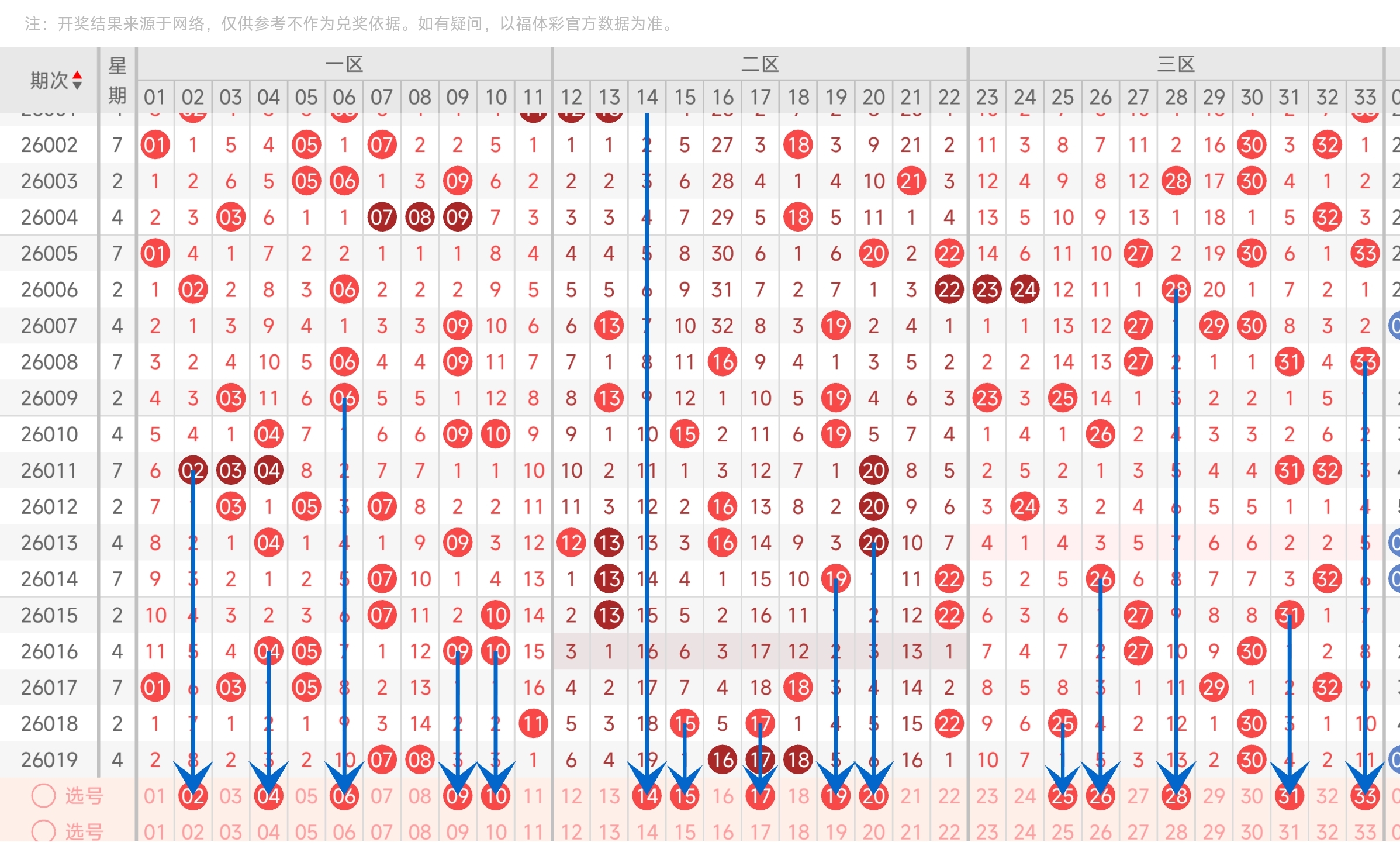 上一期三区开出了30号球。往前一期开出了25,30号球。通过走势图分析,可以看到连续2期凤尾开了30,本期继续开的概率比较小,本期看好可能会往右边移动。最后再结合冷热号和遗漏期数,本期我们可以关注25,26,28,31,33等号。综上所述本期我们推测有可能开出25,26,28,31,33等号码。