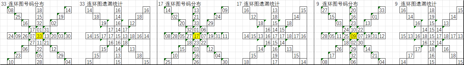 由于数据量大,不一一统计,下图为各个号码分别在33、17、9连环图上的遗漏统计汇总图: