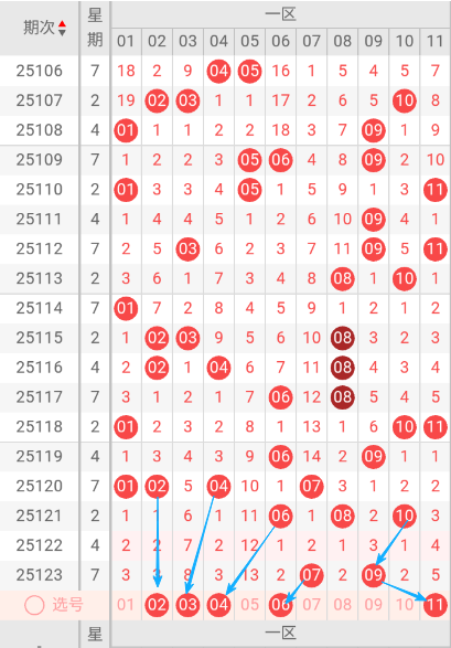根据走势图可以看出当区段, 114期开出了01一个号码球,115期开出来02.03.08三个号码球,116期开出来02.04.08三个号码球,117期开出了06.08二个号码球,118期开出了01.10.11三个号码球,119期开出06.09二个号码球 ,120期开出01.02.04.07四个号码球 ,121期开出06.08.10三个号码球 ,122期开没有出号码球 ,123期开出07.09二个号码球 ,按照如此规律本期当前区判断可能会开出1单1双或2双。我们看下当前区上期没有开出重叠号,那么本期当前区要定重叠号的情况下可关注07号码球。再看下当前区段上期没有开出斜连号,当期选号得留意06斜连号。建议重点关注02.03.04.06.11