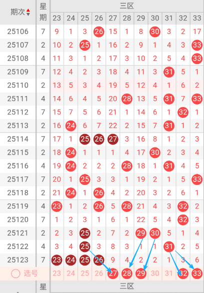 根据走势图可以看出当前区,114期开出了25.26.27三个号码球,115期开出来24.30二个号码球,116期开出来24.28.30三个号码球,117期开出了25.33二个号码球,118期开出了24.26二个号码球,119期开出23.26.28.32四个号码球 ,120期开出32一个号码球 ,121期开出25.29.30三个号码球 ,122期开出个25.31二号码球 ,123期开出23.24.25.26四个号码球 ,按照如此规律判断本期当前区可能开出2单。我们看下当前区上期开出25重叠号,那么本期当前区要定重叠号的情况下可关注23码球。再看下当前区上期开出24.26斜连号,当期选号得留意27斜连号。本区重点关注27.28.29.32.33