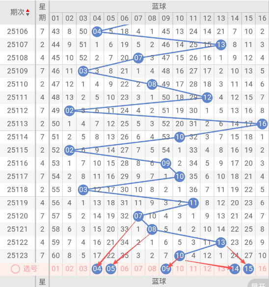 根据走势图近10期的走势看,蓝球在107期开出13蓝球之后,3小1大1小2大1小2大1小1大2小2大,再看下近10期的蓝球热码有回补的趋势,这种趋势规律本期判断极有可能开出大号,本期防蓝球03小号,蓝球本期重点关注04,05,09,14,15