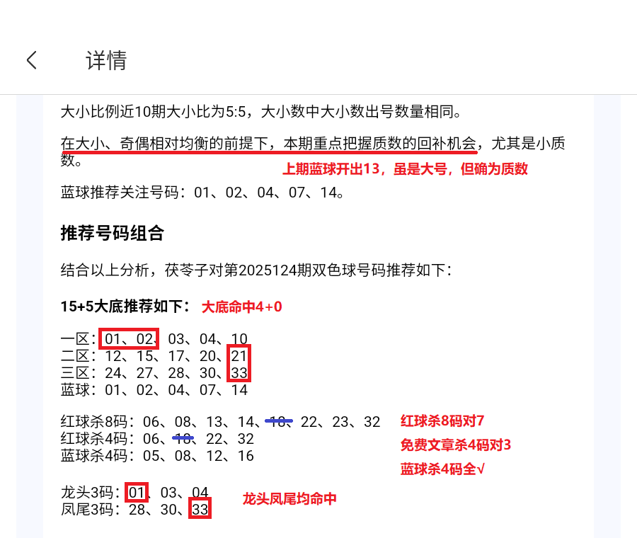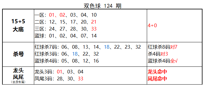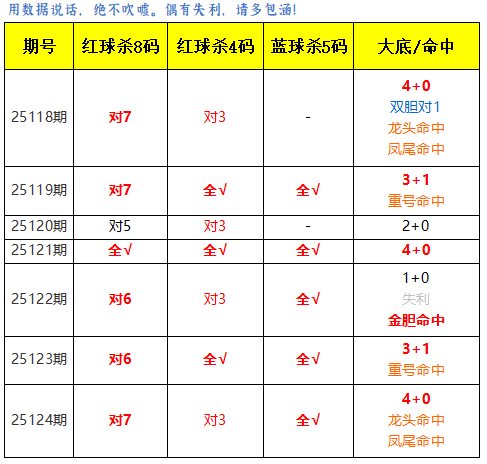 上期红球杀8码对7,免费文章杀4码对3,蓝球杀4码全对,龙头凤尾均命中,上期红球命中4码,本期再接再厉!