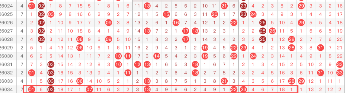 - 三区(23-33):24、25、26、27、28、32、33(7个号码)。上期三区仅开出1个号码(23),明显偏冷。本期大幅增加三区号码的权重,特别是24-28的连号潜力和32、33作为凤尾的备选,符合“冷区回补”的普遍预期。