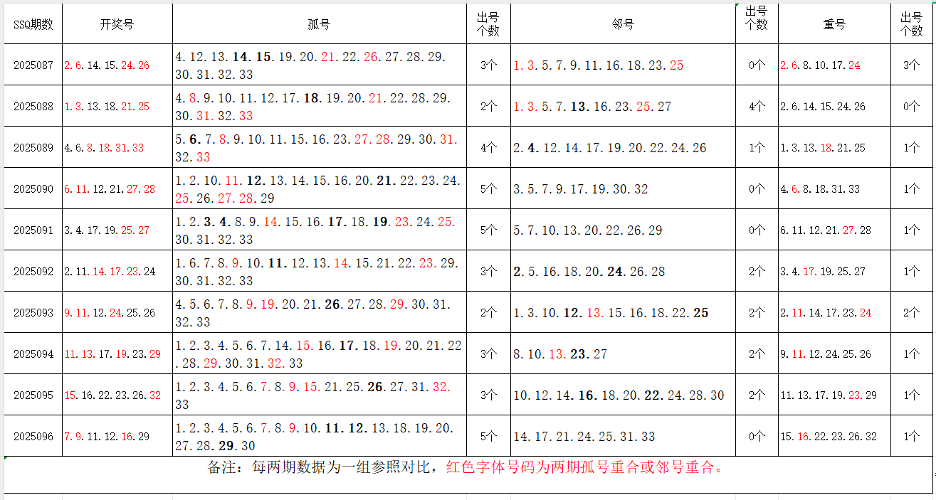如图,以近两期数据为一组,进行对比分析。相同的孤号、邻号,可能在下期出1-4个左右。上期孤号开出5个,邻号开出0个,重号1个。本期参考孤号:1.2.3.4.5.14.18.19.20.21.22.23.24.25.26.27.31.32.33;邻号:6.8.10.13.15.17.28.30。孤、邻号重合号码精选:***(会员专区可见)。个人分析,仅供参考。