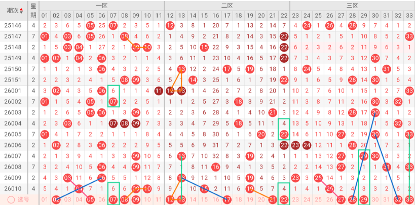 第三区间(23-33):三区上期开出号码 26,近5期出号量3-3-3-2-1。本期三连号趋势:27,隔码斜连趋势:28 32。近5期平均出2.4枚,平均出号减少。