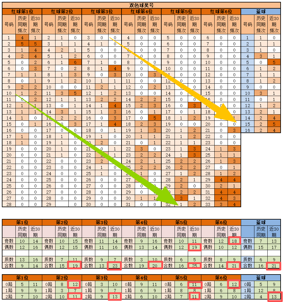蓝球,历史同期频次最多的为4-10;近30期,频次最多的为5-15,明显特征是合数2路优势;推荐重点5-14-15-16。