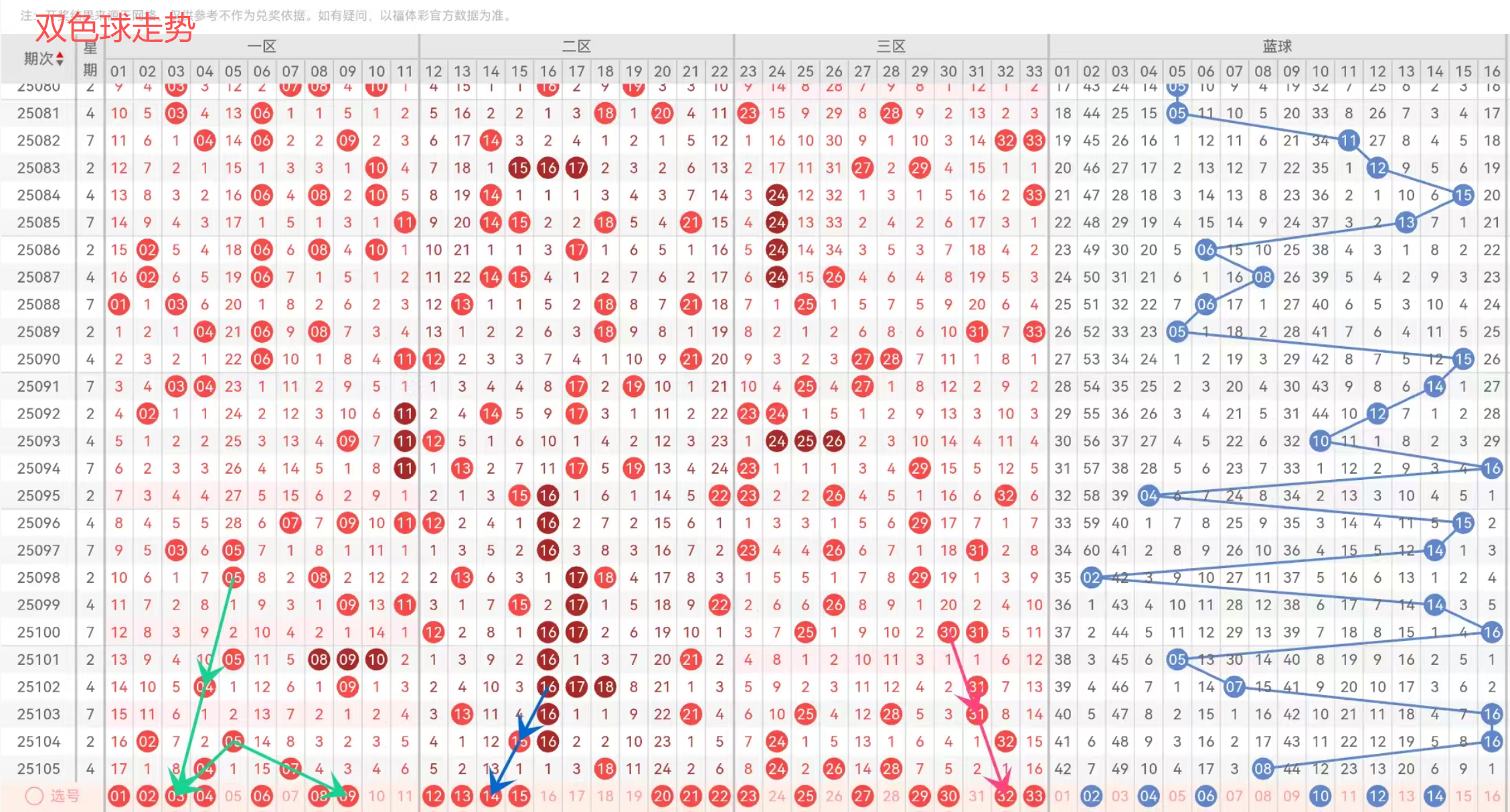 红球三区,上期出现小热门,出了3码,并且都是偶数,可以看到该区最近偶数很热门,那么本期也可以多看偶数;其中走势比较不错的有号码32;
