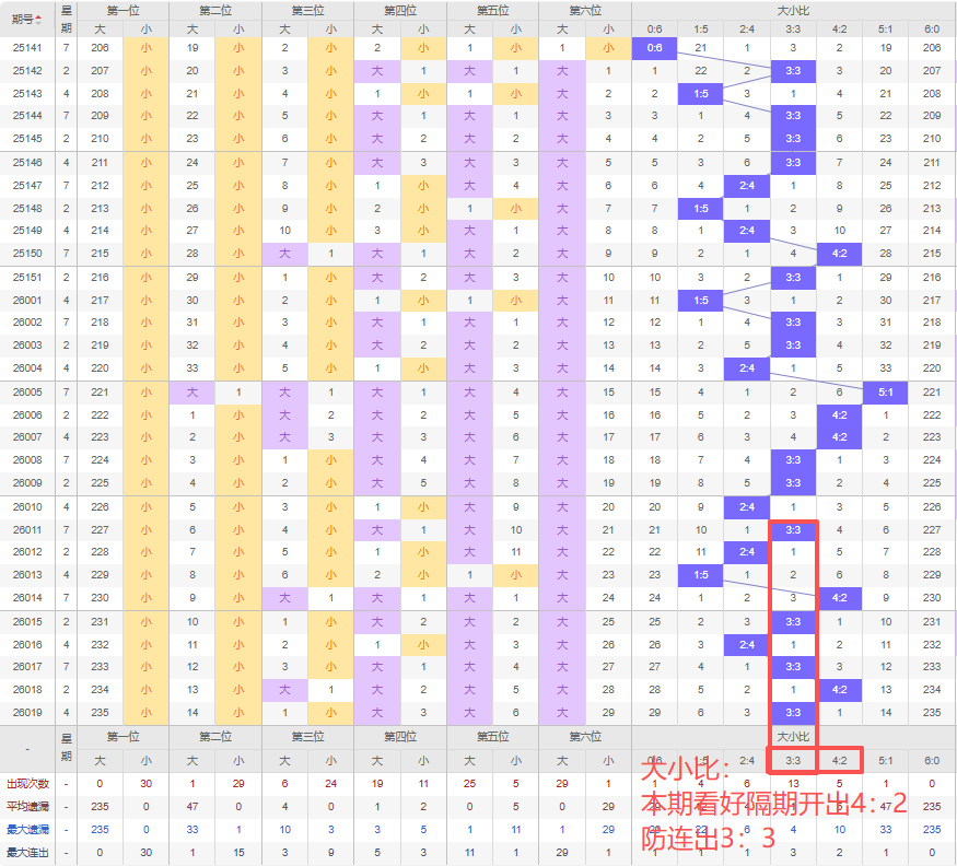 上期大小比:3:3,近10期大小比出现情况:2:4、3:3、2:4、1:5、4:2、3:3、2:4、3:3、4:2、3:3,最近10期出现4期3:3,出现2期4:2,出3期2:4,出现0期5:1,出现1期1:5,出现0期6:0,出现0期0:6,根据近10期规律本期看好隔期出4:2,防连出3:3,综上所述推荐大小比推荐:3:3,重点关注:4:2。