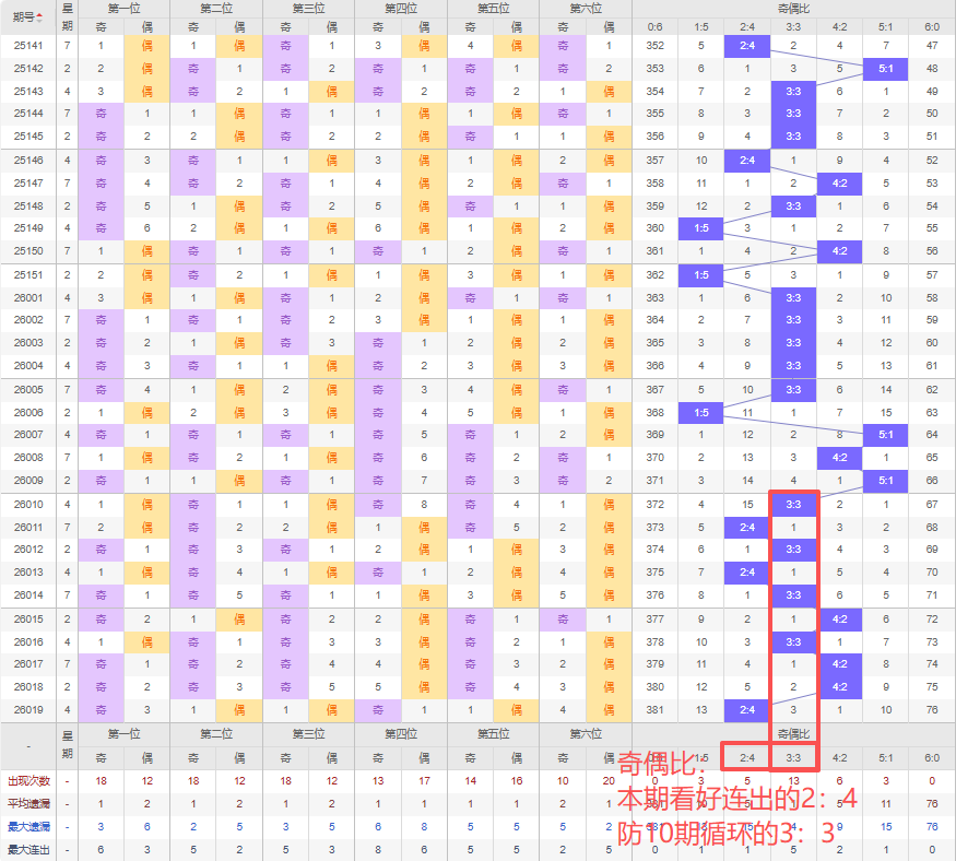 上期奇偶比:2:4,近10期奇偶比出现情况:3:3、2:4、3:3、2:4、3:3、4:2、3:3、4:2、4:2、2:4,最近10期出现4期3:3,出现3期4:2,出现3期2:4,出现0期5:1,出现0期1:5,出现0期6:0,出现0期0:6,根据近10期规律本期看好连出的2:4,防10期循环的3:3,综上所述推荐奇偶比推荐:3:3,重点关注:2:4。