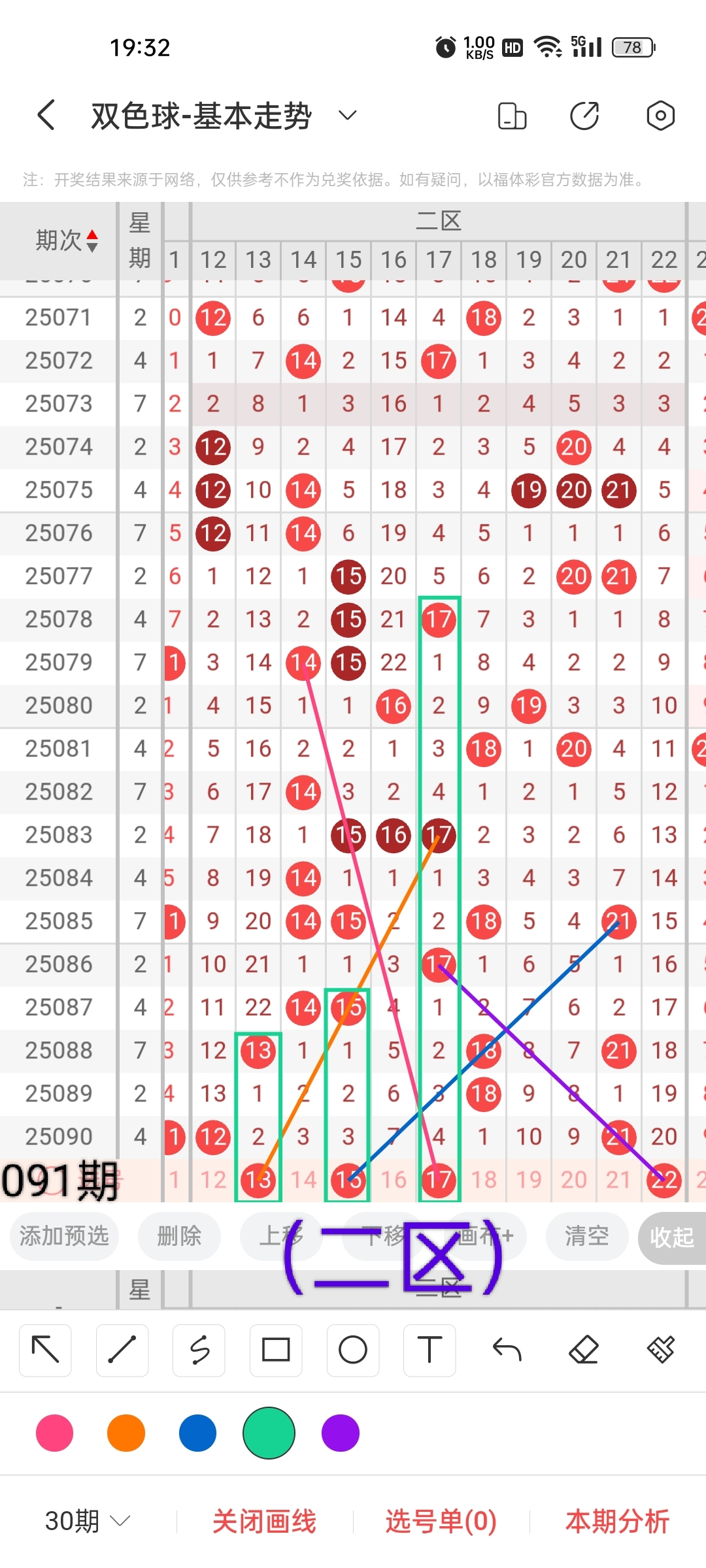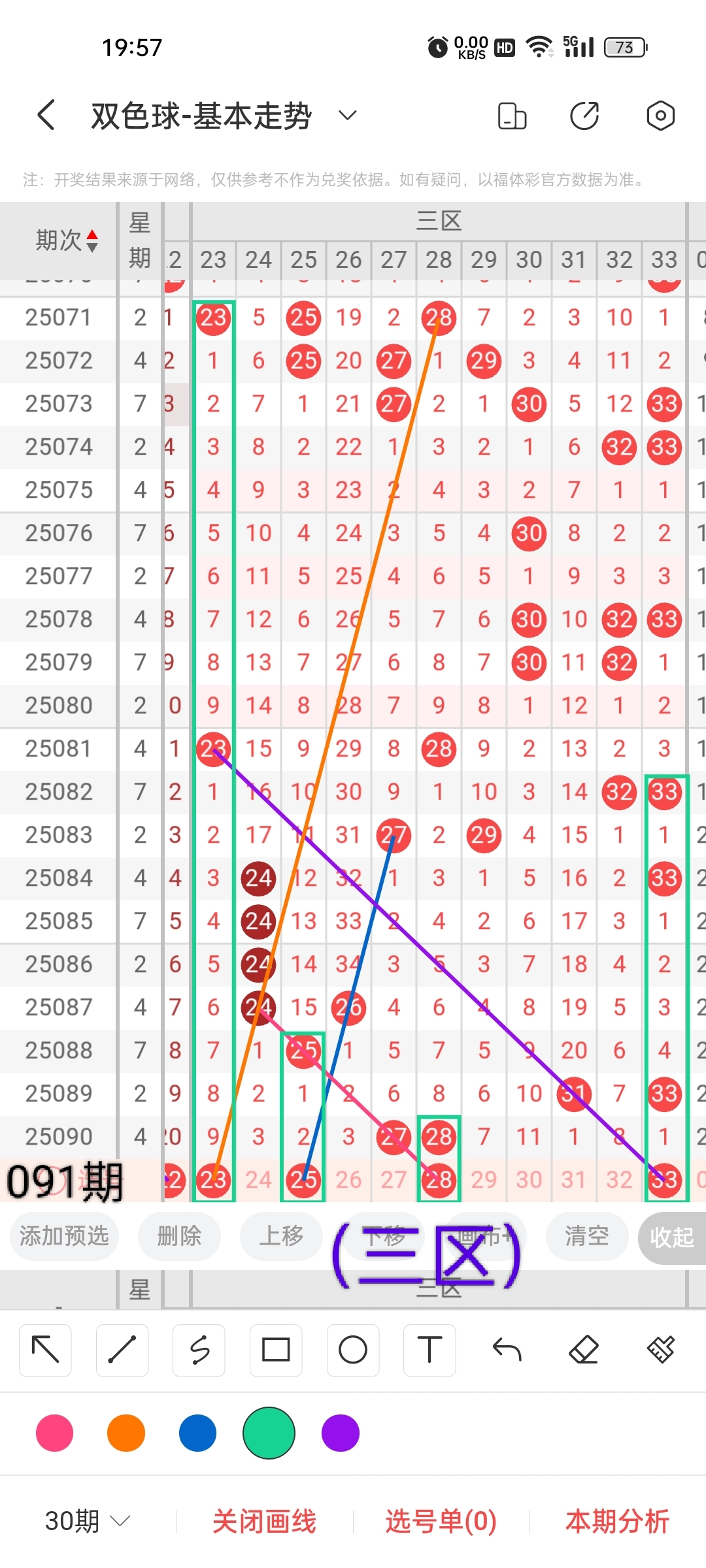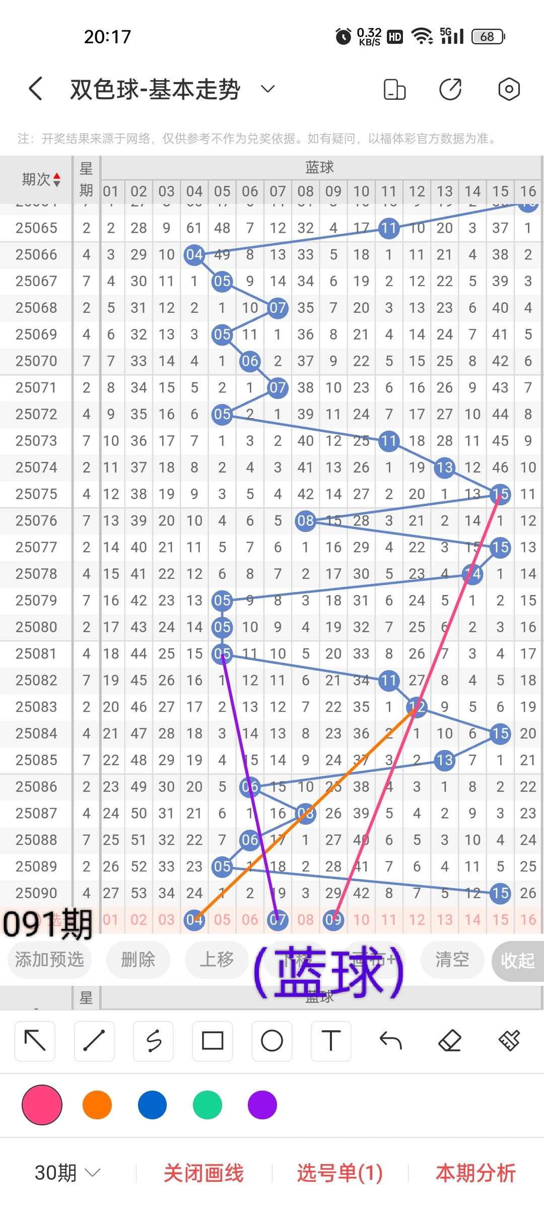 小梁根据图中画线思路,最后给大家汇总提供一下本期红球、蓝球数据,供大家参考: