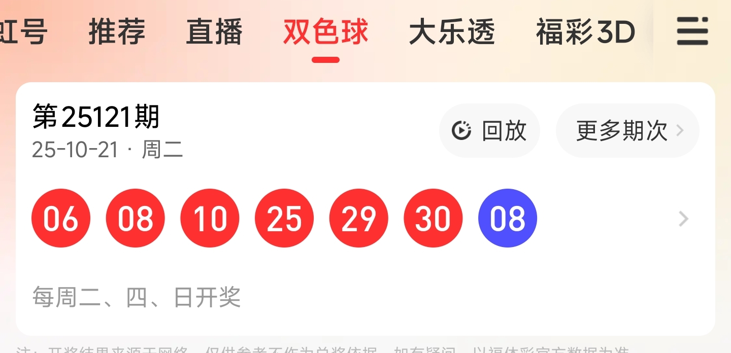 红球开出6,8,10,25,29,30。蓝球开出8。