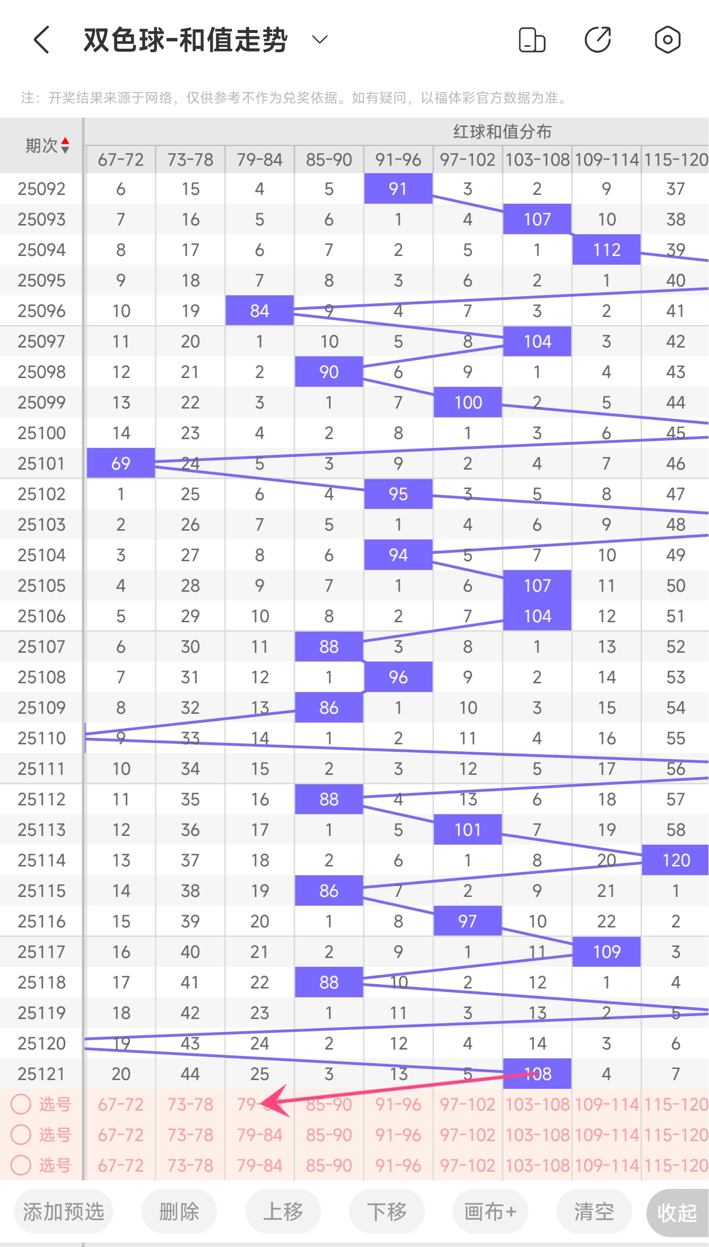 上期和值为108,而近5期和值为97,109,88,124,59,108均值97.6,上期和值较前一期增加了49,振幅为49。108和值是属于近30期内开出的比较大的和值,上升的空间已经比较小,下降的空间很大。所以推测本期和值趋势是大概率往左下降,和值变小,小概率继续往右,和值变大。