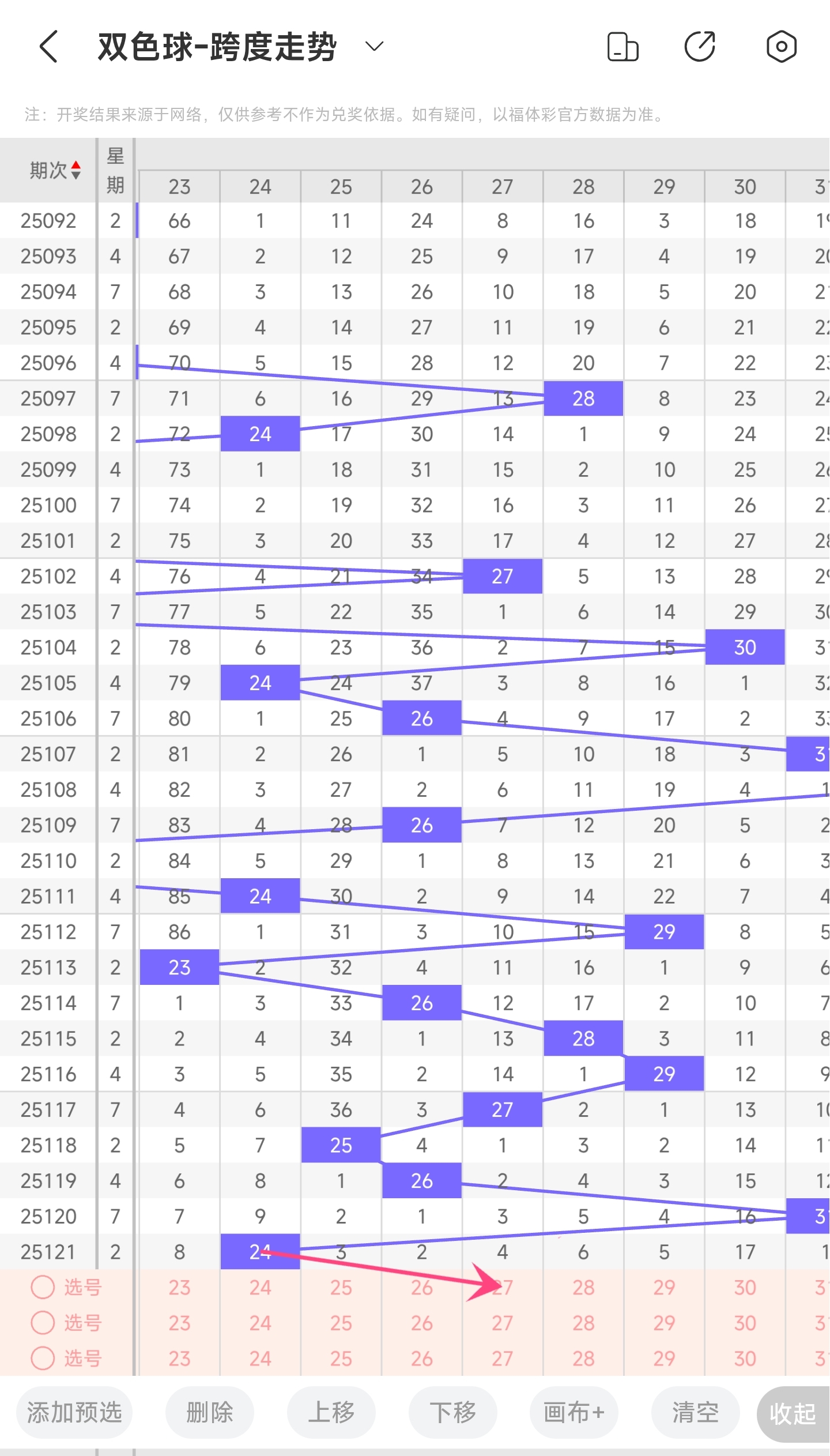 上期龙头为6,凤尾为30,跨度为24,往前一期跨度是31,偏移量为7。24跨度值是30期内开出的比较大的跨度值。上升的空间是比较小的,但本期看好大跨度值。因此推测本期跨度有大概率趋势是往右的,跨度小幅度变大,小概率继续往左,跨度小幅度变小。