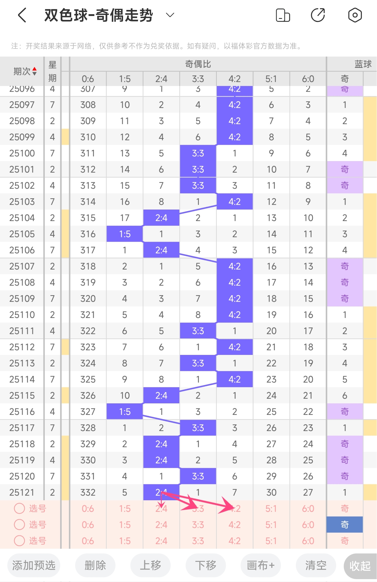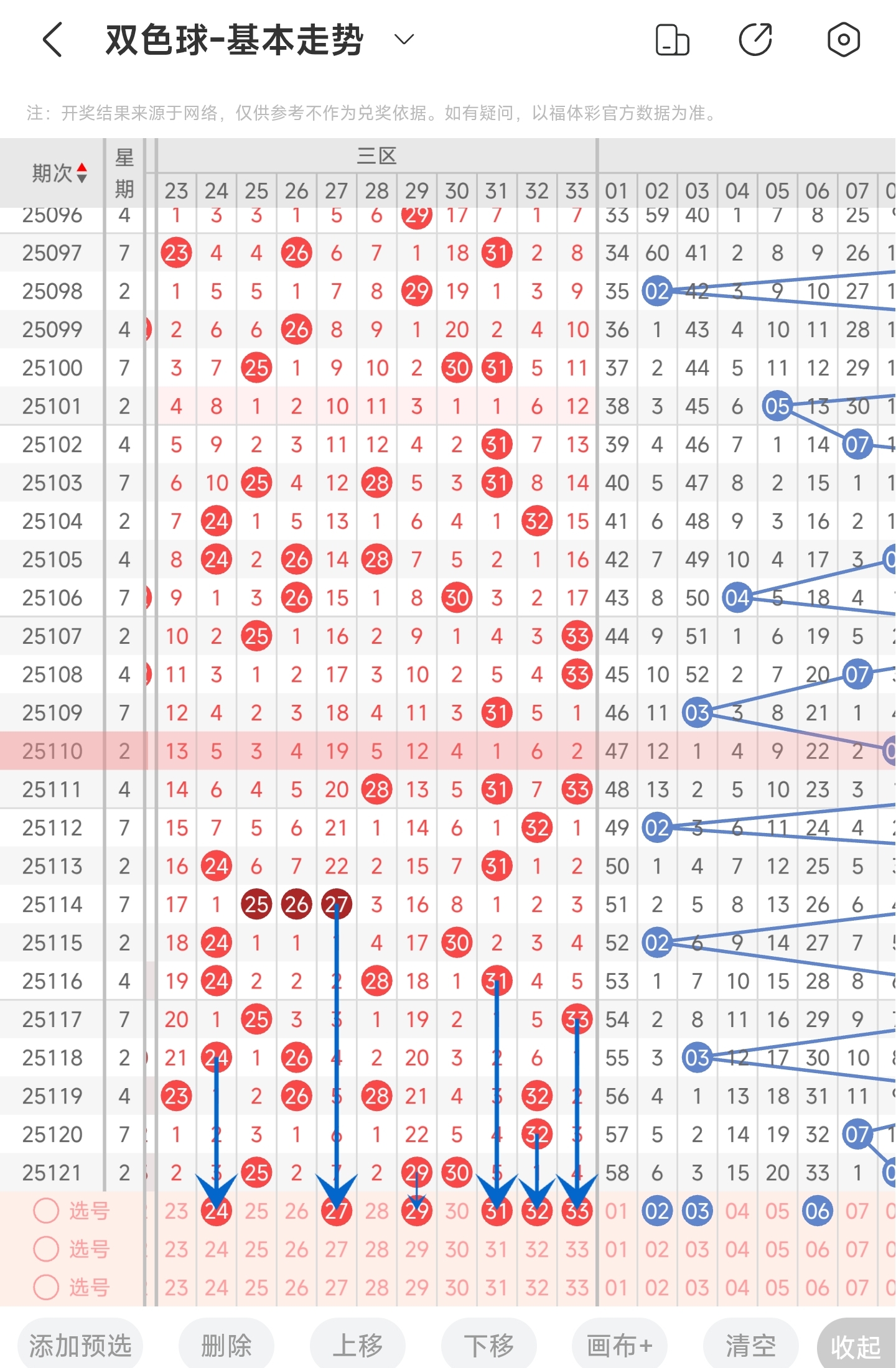 上一期三区开出了25,29,30号球。往前一期出了32号球。通过走势图分析,可以看到凤尾走势是比较稳定的,大多数情况下都开了右边的号码,其它的号码的话,则是左边和中间的号码都有开出,所以本期左边和中间的号码都有关注一下。然后再结合冷热号和遗漏期数,本期我们可以关注24,27,29,31,32,33等号。综上所述本期我们推测有可能开出24,27,29,31,32,33等号码。