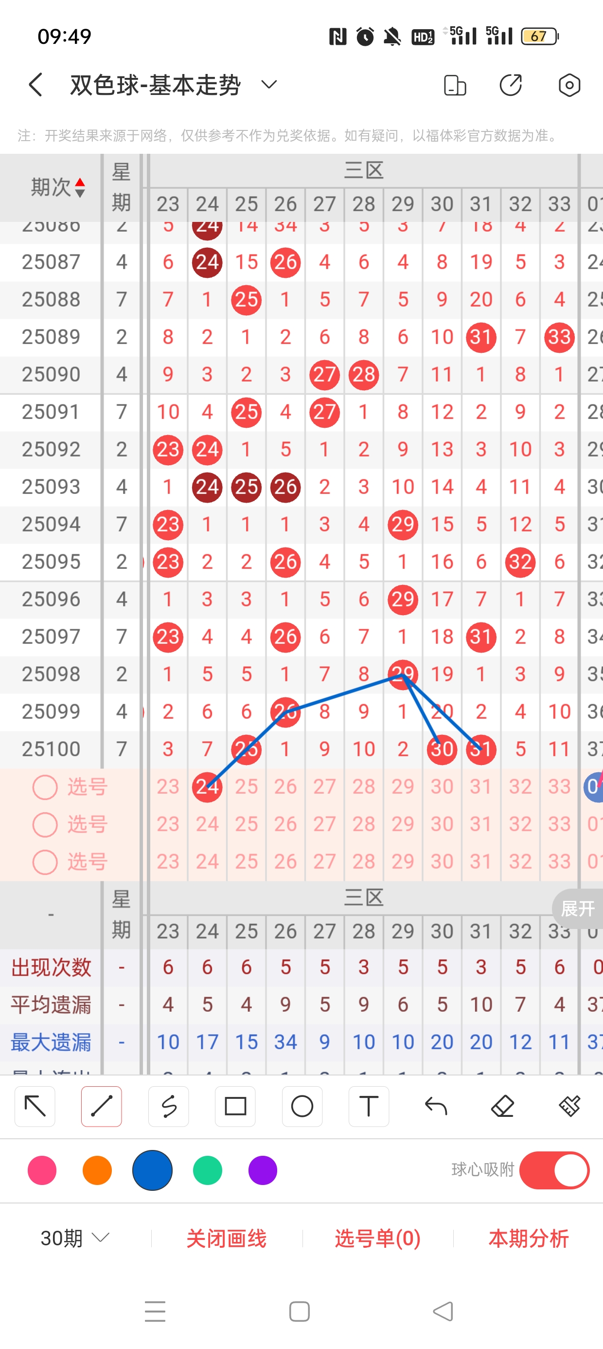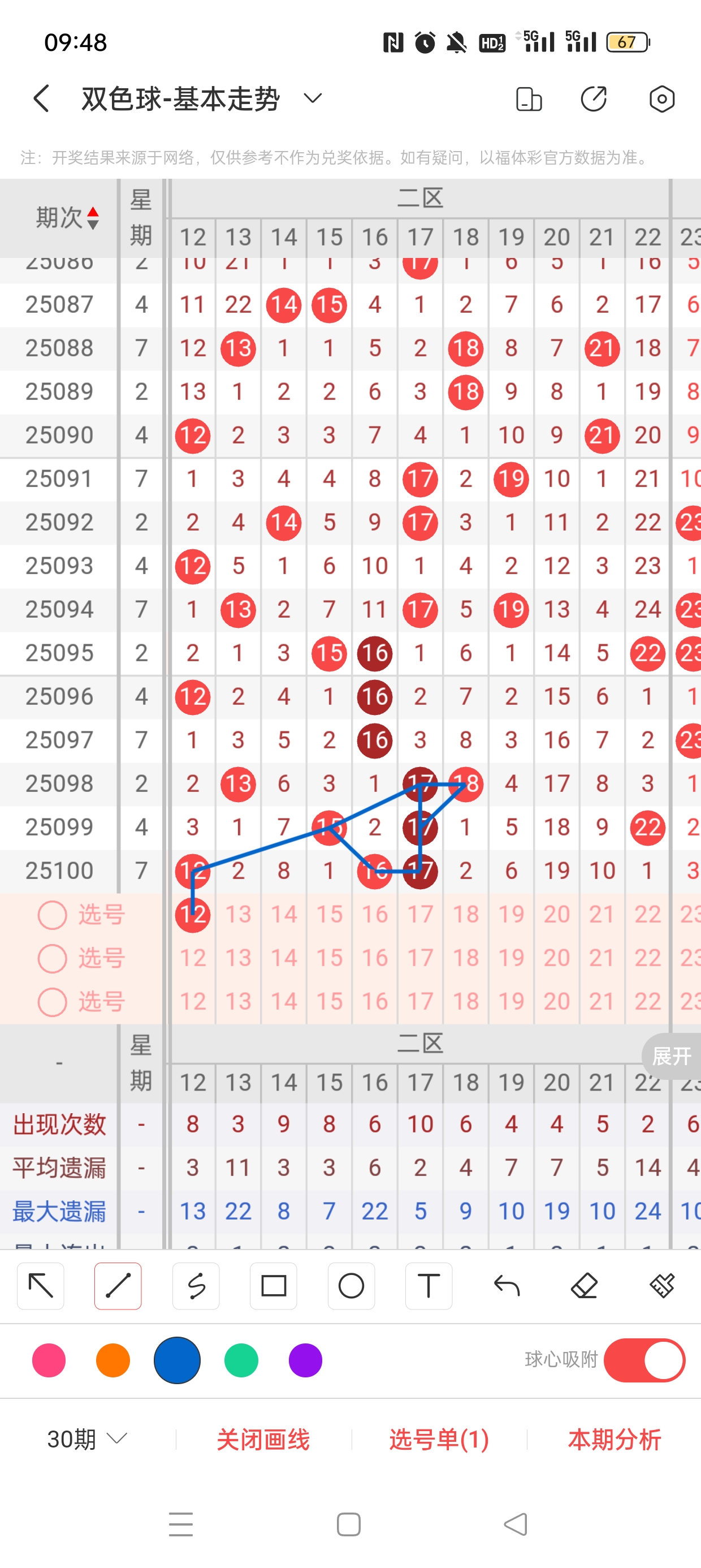 25100期开奖结果:12、16、17、25、30、31+16,奇偶比3:3,大小比3:3,和值131,012路231,邻孤传0邻5孤1传,无同尾号,传号17,连号16、17、30、31。总结完毕,下面开始本期分析。