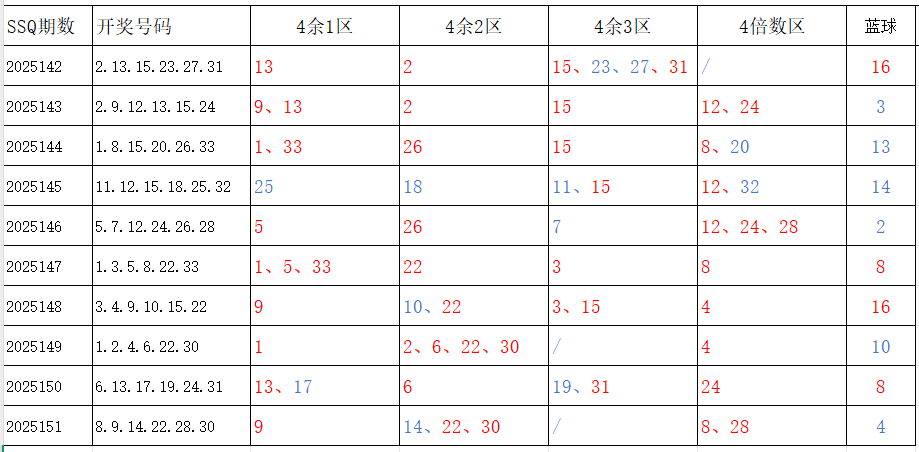 分享第一个数据分析:四分区统计数据。相对于传统的三分区,个人习惯使用四分区,就是把33个红球号码除以4,所得的余数分区如下: