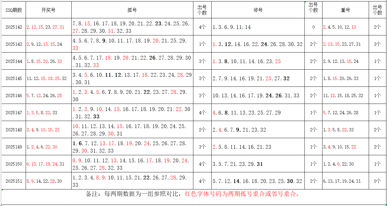 如图,以近两期数据为一组,进行对比分析。相同的孤号、邻号,可能在下期出1-4个左右。上期开出孤号4个,邻号2个,重号0个。本期参考孤号:1.2.3.4.5.6.11.12.16.17.18.19.20.24.25.26.32.33;邻号:7.10.13.15.21.23.27.29.31;孤、邻号重合号码精选:***(会员专区可见)。个人分析,仅供参考。
