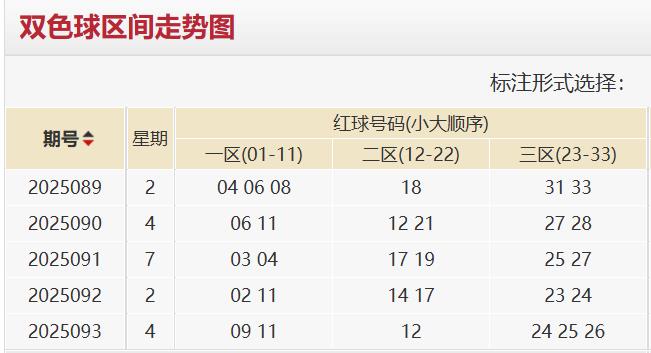 近五期一区号码数量为3+2+2+2+2=11枚,整体占比为36.7%;二区号码数量为1+2+2+2+1=8枚,整体占比为26.6%;三区号码数量为2+2+2+2+3=11枚,整体占比为36.7%。一区占比高于均值,周期内波动稳定,呈现下降趋势,本期出号数量倾向于减少。二区占比最低,呈下降趋势,鉴于整体波动,本期考虑回调。三区占比高于均值,呈上升趋势,鉴于整体波动,慎防。基于波动趋势衡量以及动态平衡干预,本期区间比倾向于1:4:1。