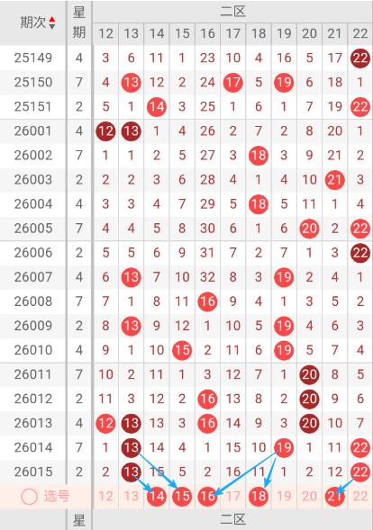 根据走势图可以看出当前区段,005期开出20.22二个号码球 ,006期开出22一个号码球 ,007期开出13.19二个号码球 ,008期开出16一个号码球 ,009期开出13.19二个号码球 ,010期开出15.19二个号码球 ,011期开出20一个号码球 ,012期开出16.20二个号码球 ,013期开出12.13.16.20四个号码球 ,014期开出13.19.22三个号码球 ,015期开出13.22二个号码球 ,按照如此规律本期当前区可能开出2双或1单1双。我们看下当前区上期开出13.22重叠号,那么本期当前区要定重叠号的情况下可关注22号码球。再看下当前区上期没有开出斜连号,当期选号得留意斜连21号码球。本区重点关注14.15.16.18.21