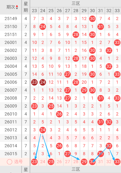 - 2:2:2:三区均衡出号,双色球中出概率最高的区间比