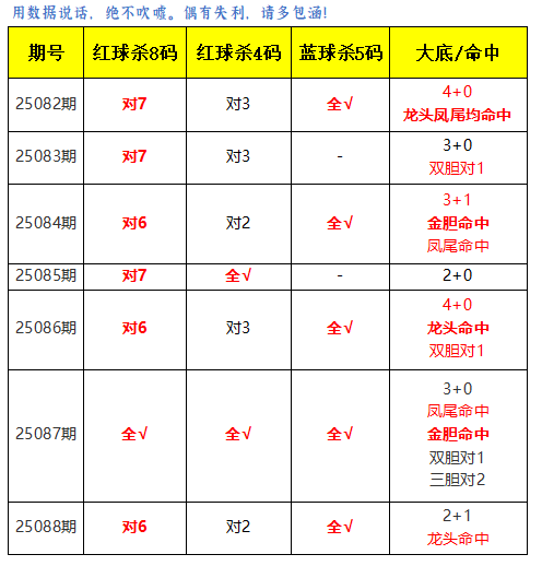 上期红球杀8码全,免费文章杀4码全对,蓝球杀5码全对,本期连续4期蓝球杀号全对,龙头命中,大底命中4+1,本期再接再厉!