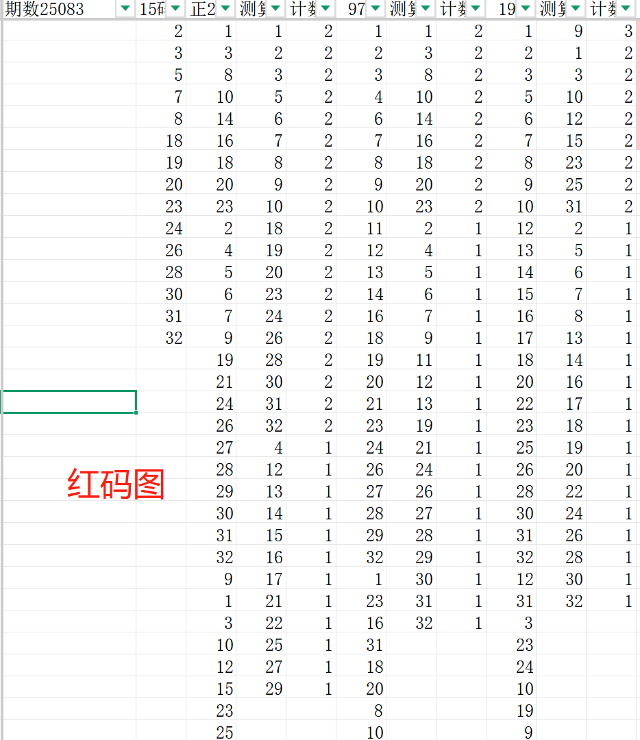 得出一组红码数据就是:2 3 5 7 8 18 19 20 23 24 26 28 30 31 32